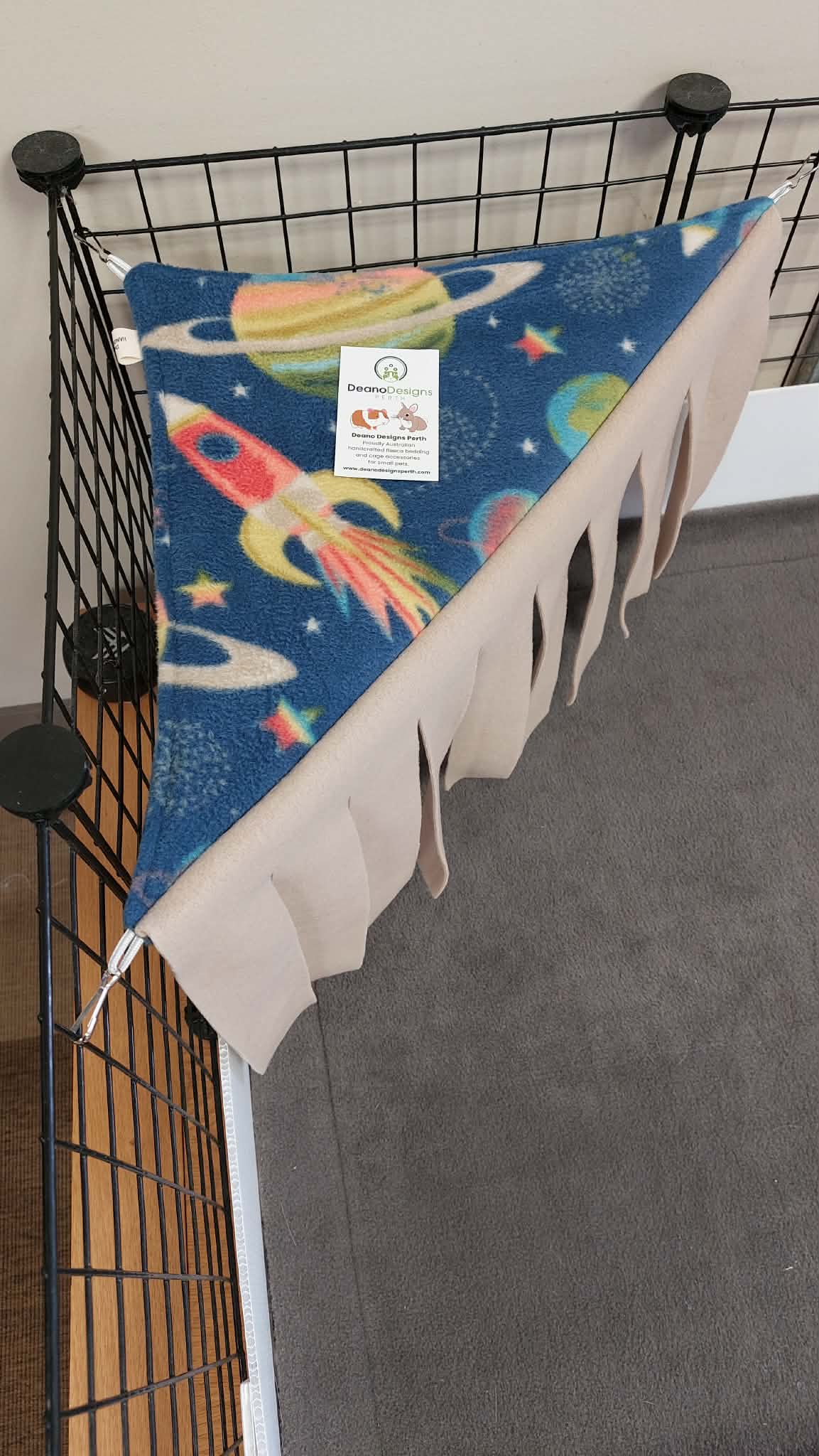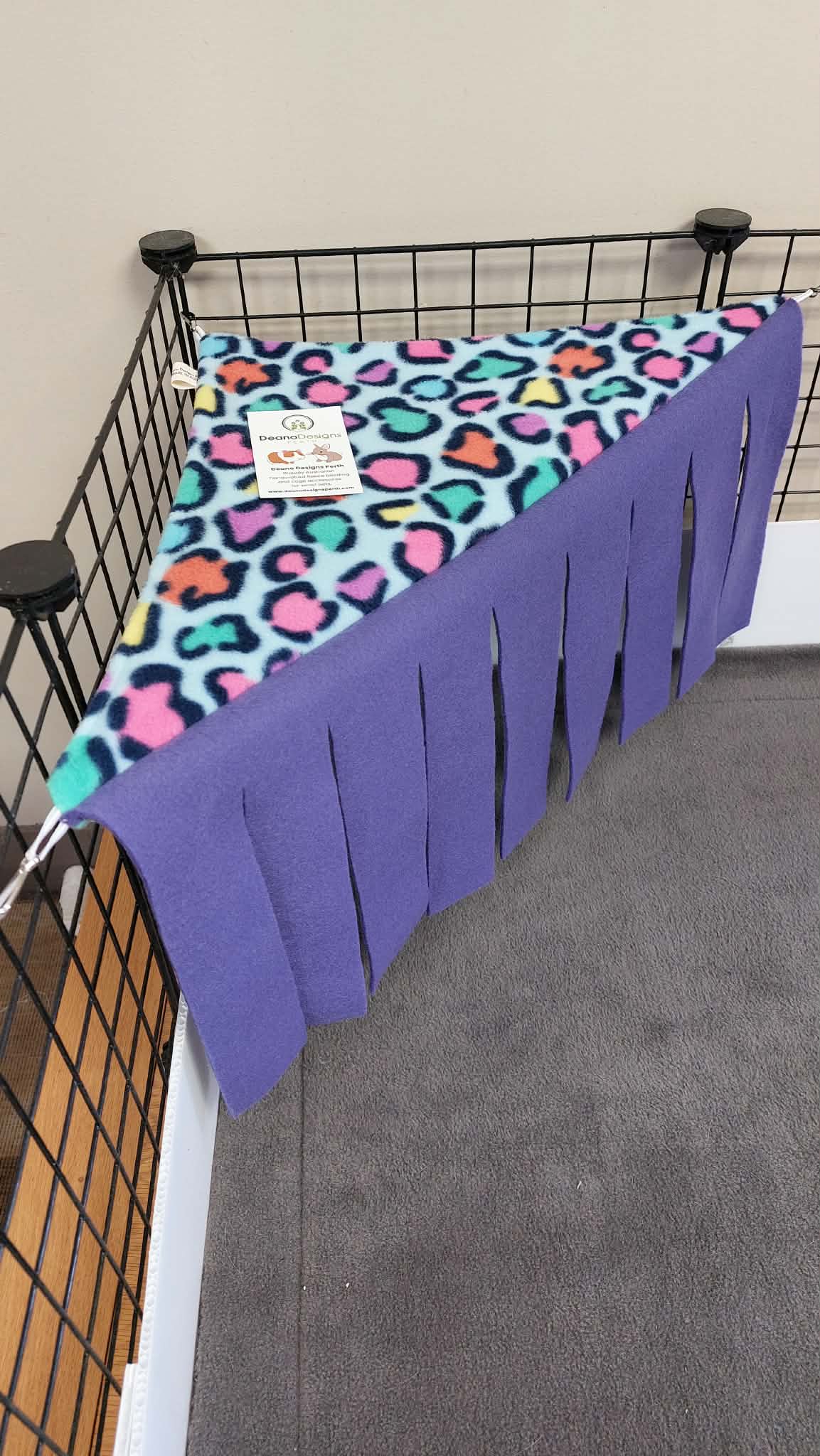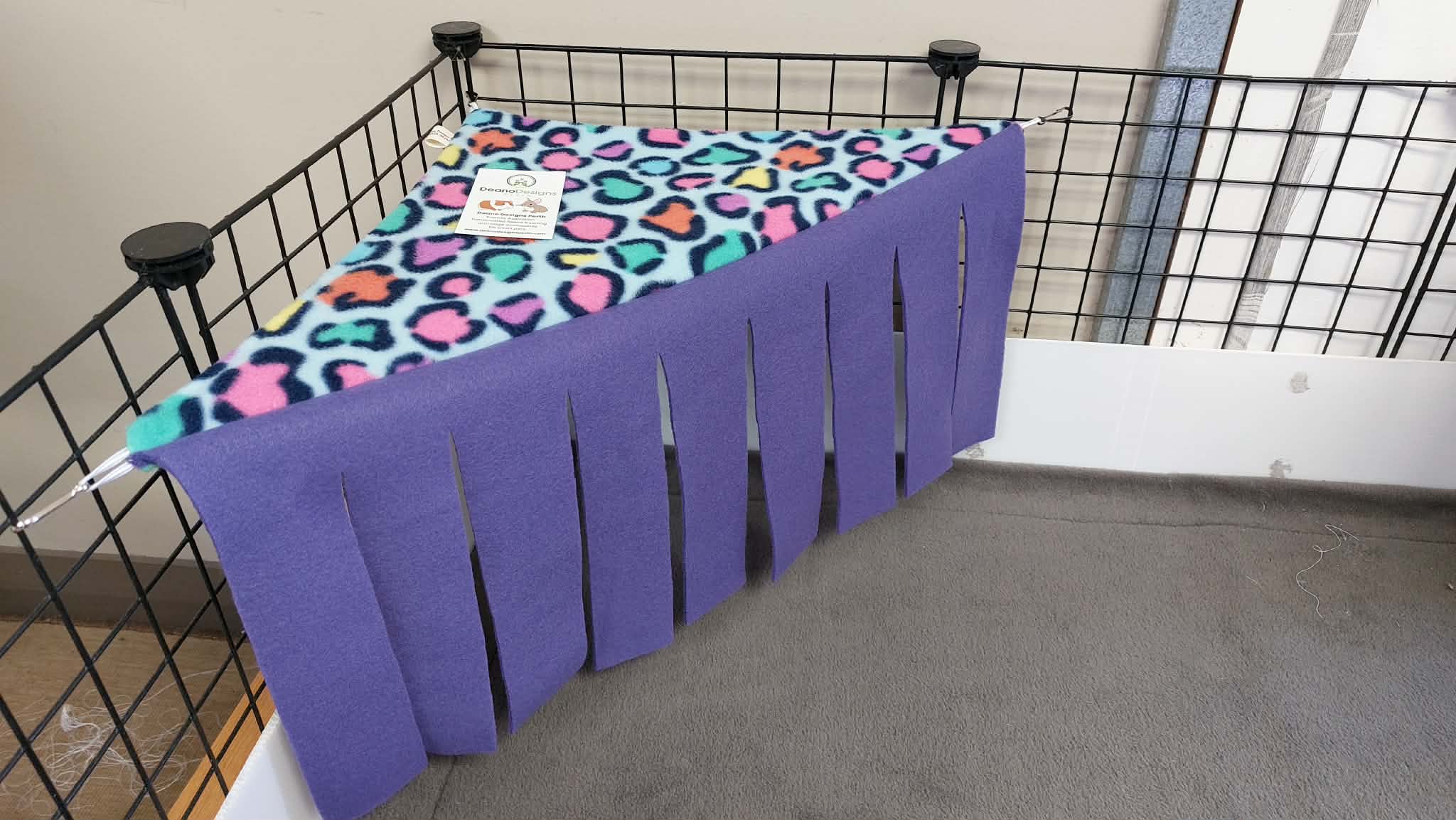 Made as a Fleece Corner hammock with a Fleece Fringe on the front side making it an ideal place for Guinea Pigs and also Rabbits to hide away.