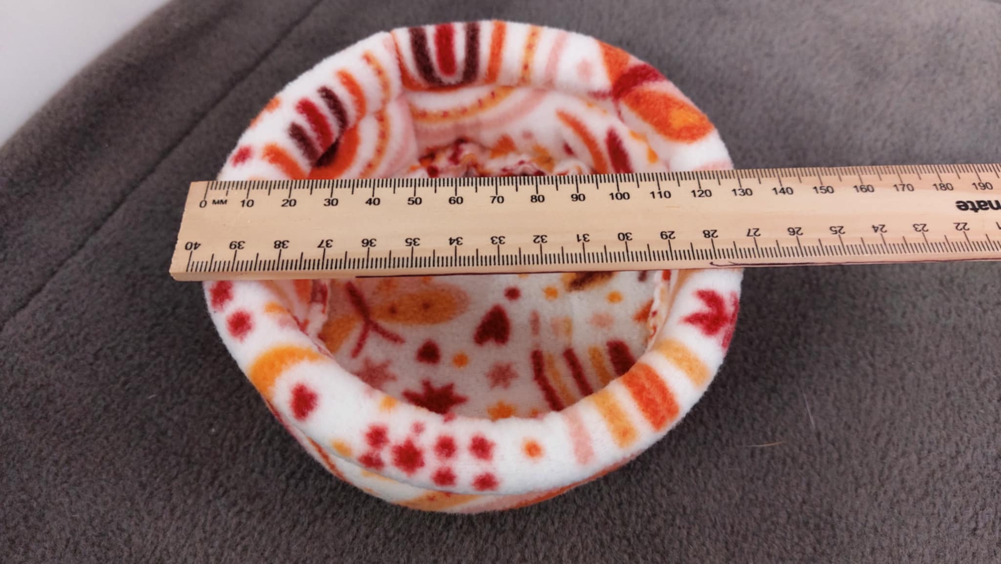 FINISHED SIZE: 21cm across, walls 5cm high. Internal seams are overlocked, absorbent core in base is non toxic, cotton based.