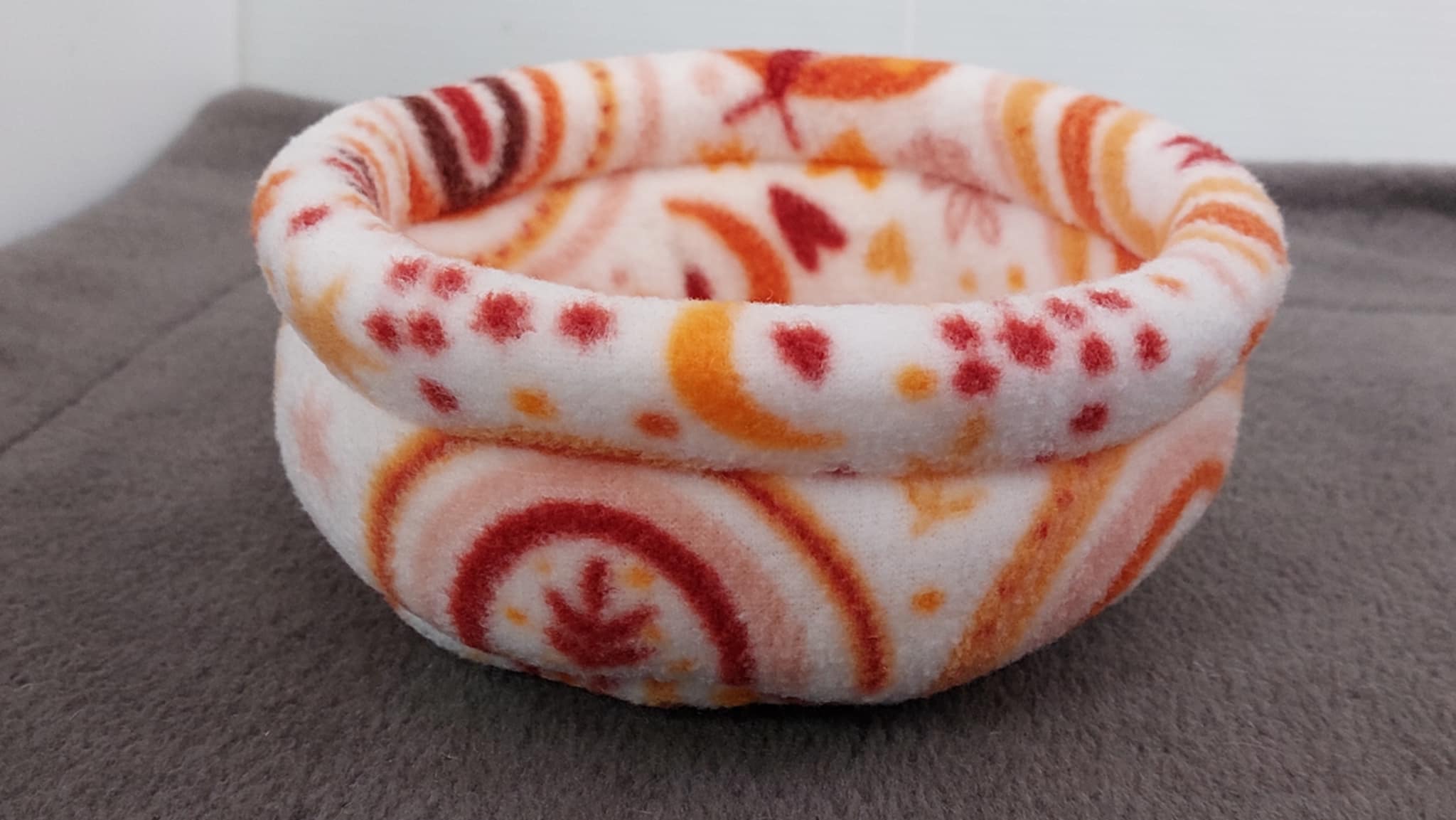 This cute little cup style bed is made from fleece inner and outer, with foam in the walls, and an absorbent layer sewn into the base.