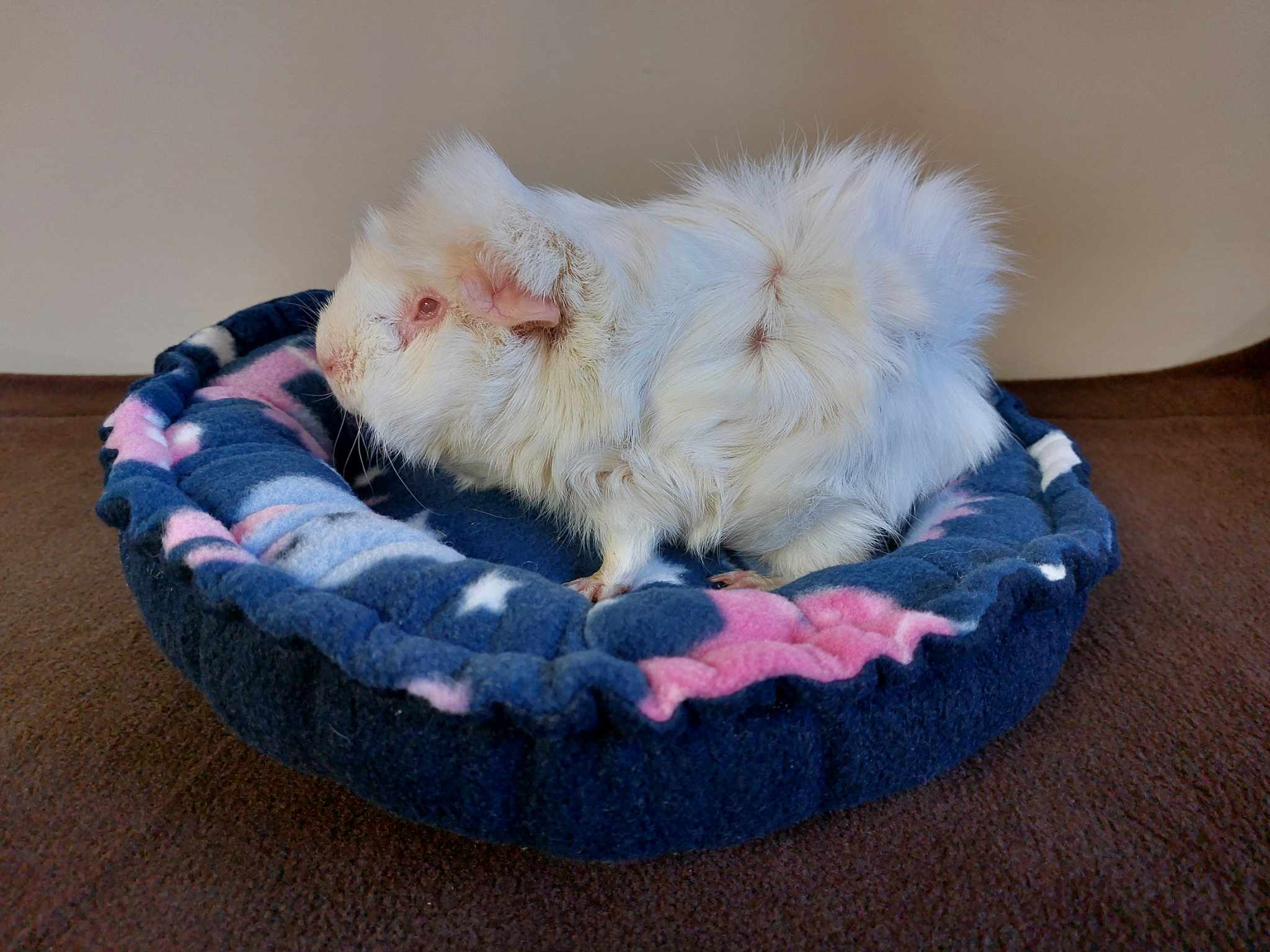 LARGE – 50cm across (the pillow section in the middle is 30cm) – so big enough for cats, teeny dogs, bunnies and guinea pigs.